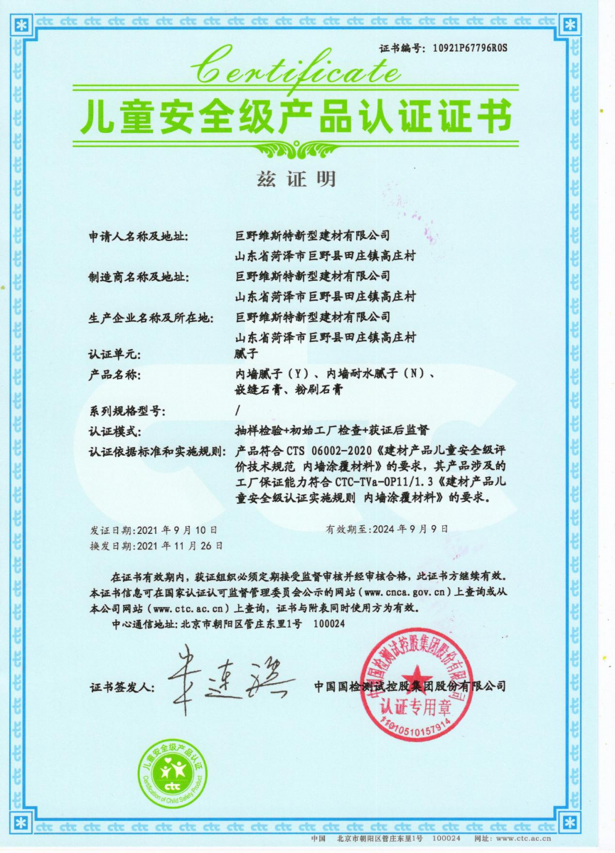 該系列通過(guò)中國(guó)建材中 心頒發(fā)的“兒童安全級(jí)認(rèn)證證書”。(該證書是行業(yè)內(nèi)第二個(gè)榮獲兒童安全認(rèn)證產(chǎn)品),voc(揮發(fā)性有機(jī)化合物)、甲醛甲苯以及重金屬含量檢測(cè)標(biāo)準(zhǔn)要更加嚴(yán)格,產(chǎn)品符合《建材產(chǎn)品兒童安全級(jí)評(píng)價(jià)技術(shù)規(guī)范 內(nèi)墻涂覆材料》要求。